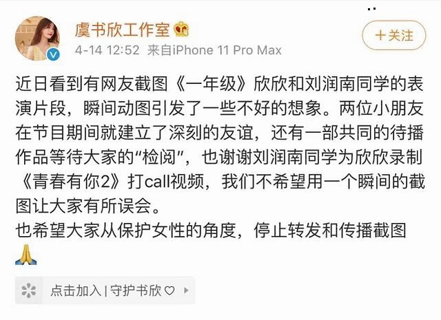 在此之前,虞书欣和刘润南双方的工作室也都发文表态,称俩人之前已经建立了深刻的友谊,不希望用一瞬间的截图让大家误会。