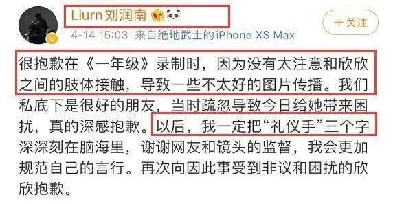针对这件事情,刘润南倒是道歉了“没有太注意和虞书欣之间的肢体接触,导致不太好的图片传播。”