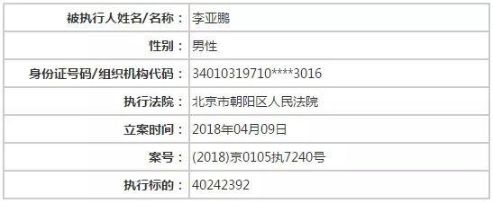 多年前,李亚鹏和哥哥李亚炜投资房地产六年失败,甚至被告上法院,遭索赔4000万人民币。由于李亚鹏未及时还清债务,还被列为失信名单。