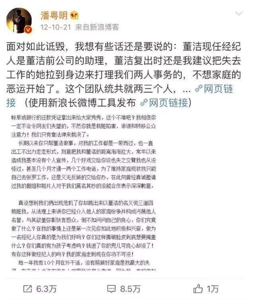 面对董洁工作室的指控,潘粤明也只是质问董洁的经纪人,并没有说一句关于董洁的不是。