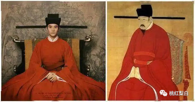 王凯饰演的赵祯坐在龙椅上,从头上戴的帽子到脚上穿的鞋子,都和古画中宋仁宗的穿着别无二致,手腕袖口白色衬里都一模一样。