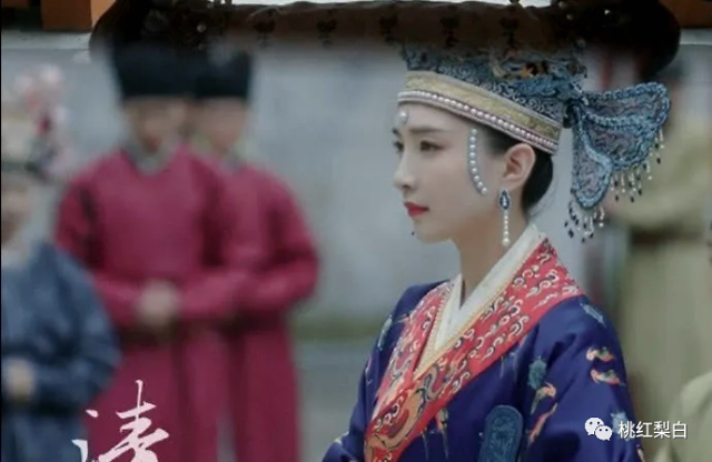 江疏影的皇后造型,额头和两鬓贴着珍珠作为吊坠,是在宋朝流行的女子装扮,被称作珍珠花钿妆。