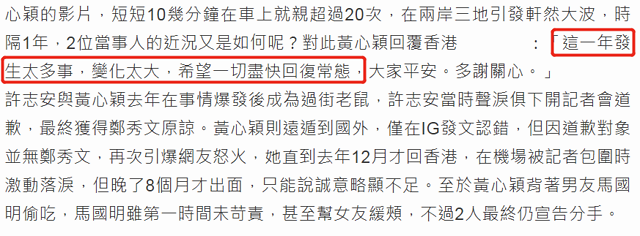 黄心颖在最新的采访中回应到,“这一年发生太多事,变化太大,希望一切尽快恢复常态。”的确,对于黄心颖来说,这一年经历的起伏实在是太大了。