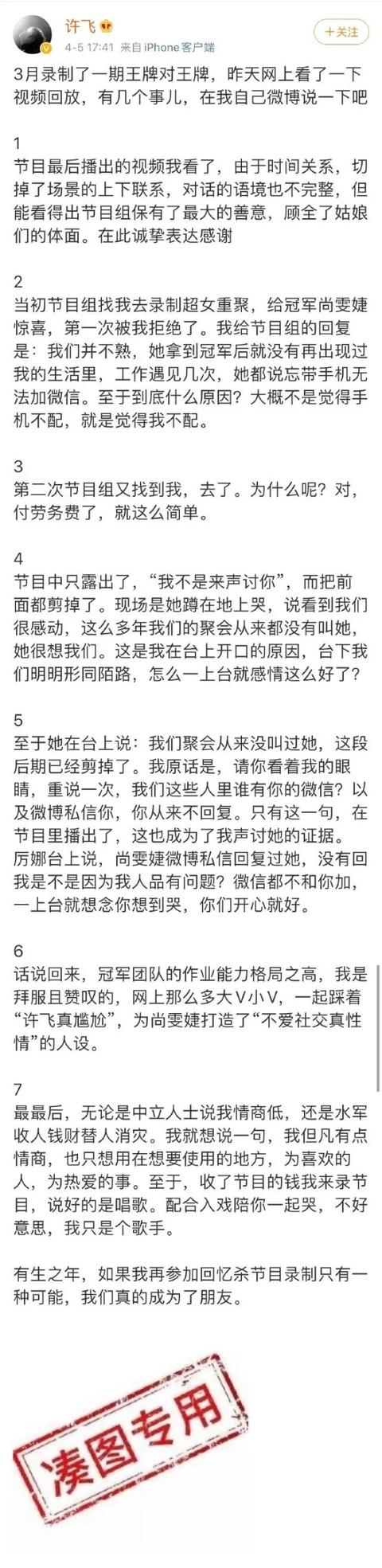 简单复盘一下这个时间,4月初一期主题为快女重聚的综艺《王牌对王牌》播出后,随即许飞就在网上发了一篇长文拉开了06届超女的互撕大战,许飞跳出来表示自己跟尚雯婕并不熟,不愿意演戏。