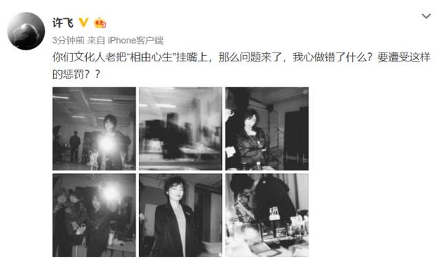 面对网友攻击,许飞一再发文向网友求饶,15日晚许飞再发文喊冤,硬核怼网友:“你们文化人老把“相由心生”挂嘴上,那么问题来了,我心做错了什么?要遭受这样的惩罚?? ”