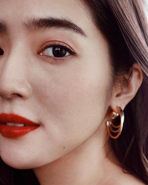 她的这种偏大的五官很适合港风妆容,核心要素就是化妆的时候用修容提升面部立体感。她的妆容视频里也强调在鼻梁和眉骨上打高光。用大地色系的眼影铺满眼妆,唇妆用复古红或者红棕红唇膏。