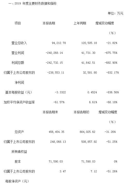 公告中显示,2019全年北京文化营业总收入约为9.42亿元人民币,相比较上年同期下降了21.82%;营业利润约为-24.03亿元人民币,该数据的上年同期为盈利4.17亿元人民币,降幅超过650%;归属于上市公司股东的净利润为-23.86亿元人民币,降幅达到了832.17%。