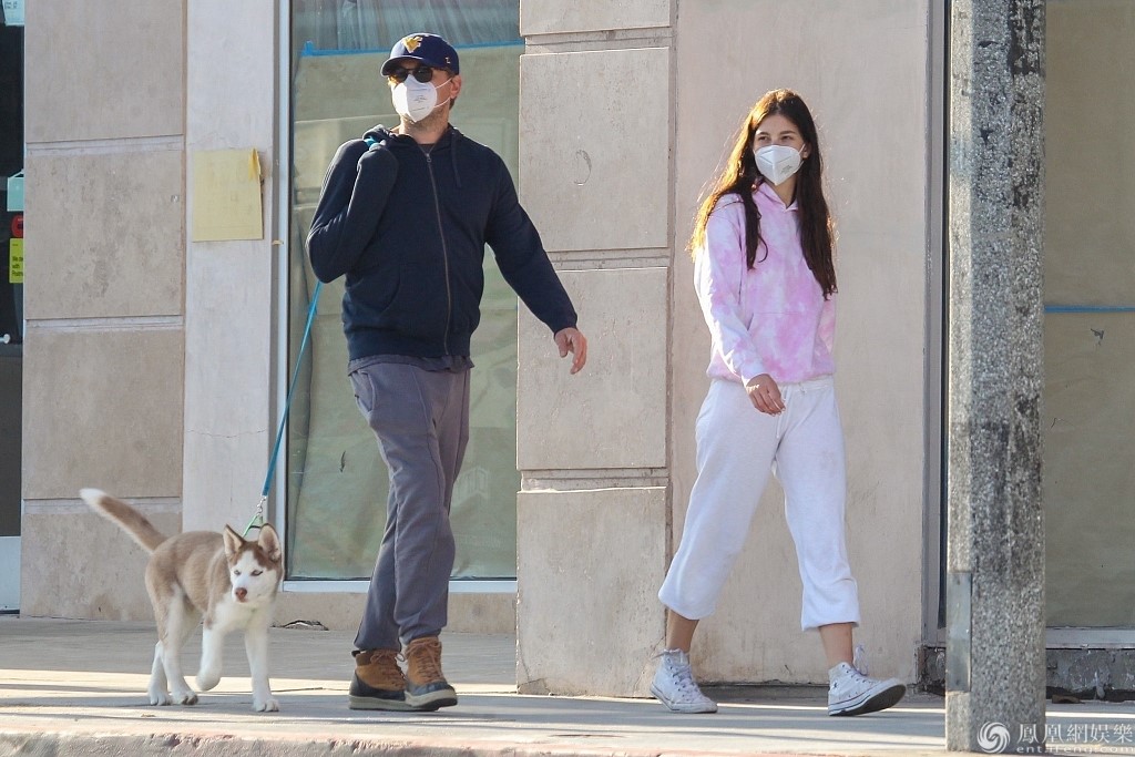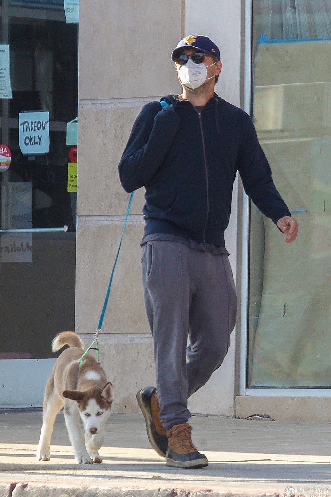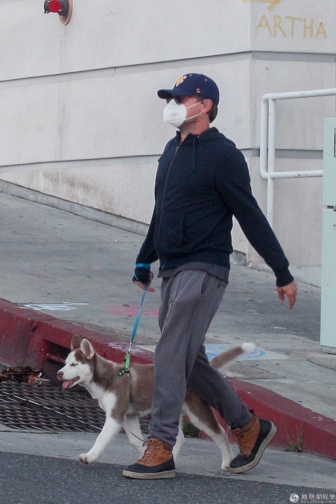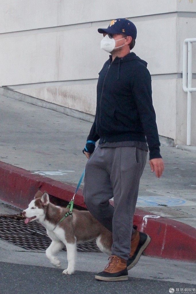 莱昂纳多牵哈士奇与女友散步,两人戴好口罩出行。