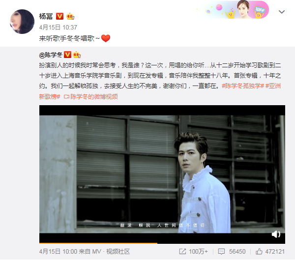 可即使在各种恋情实锤面前,杨幂和魏大勋也都保持沉默,不作出任何的回应。4月15日,杨幂也在风波之后,首次更新了个人动态,但却是为陈学冬的新歌做宣传。