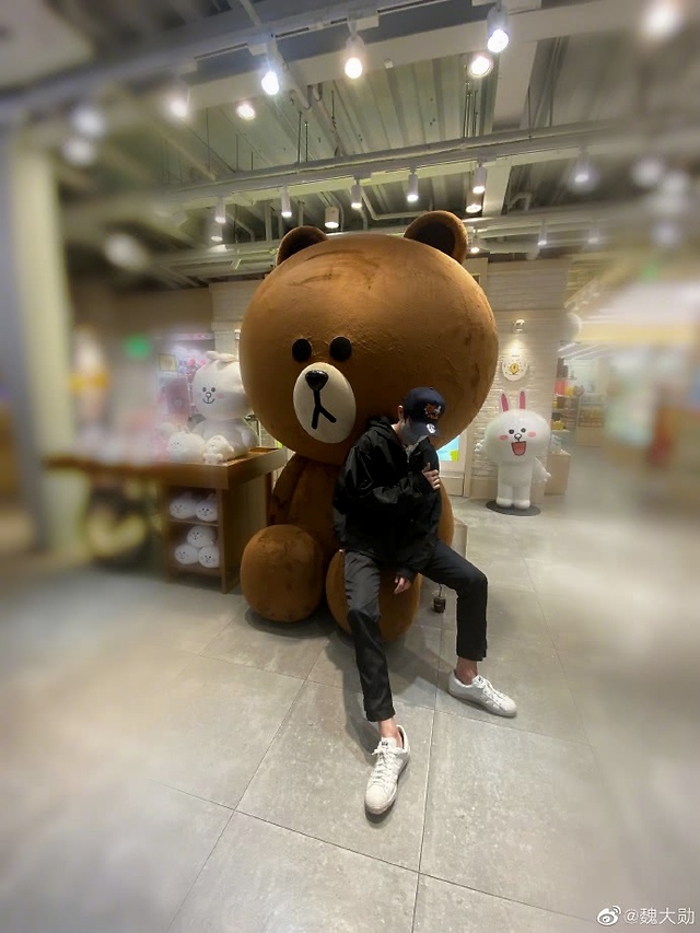 随后,魏大勋也晒出了一张帅气的照片,坐在一个超大的布朗熊腿上,戴着口罩和帽子,一双大长腿也无处安放,旁边还有一杯饮料,看来魏大勋也特别懂得享受生活。