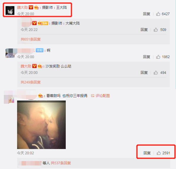而魏大勋却特意在留言区表示这张照片是王大陆帮忙拍摄的,可其中有一条两千多个点赞的留言最受关注了,是杨幂和刘恺威的接吻照,该网友还配文:“看着甜吗?也祝你三年报俩”,这话也十分引人猜想。