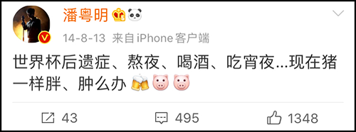 2014年,世界杯熬夜喝酒吃宵夜,潘粤明说自己现在像猪一样胖,