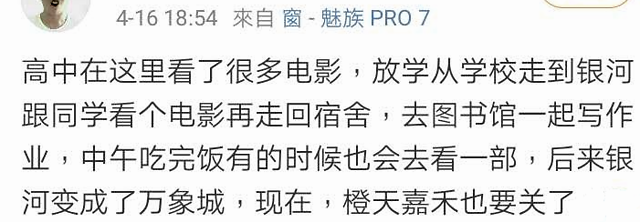 4月16日凌晨,资料显示就职于天津橙天嘉禾银河影城的微博网友@猫围脖发文称,“橙天嘉禾银河影城将于2020年4月17日永久闭店”。