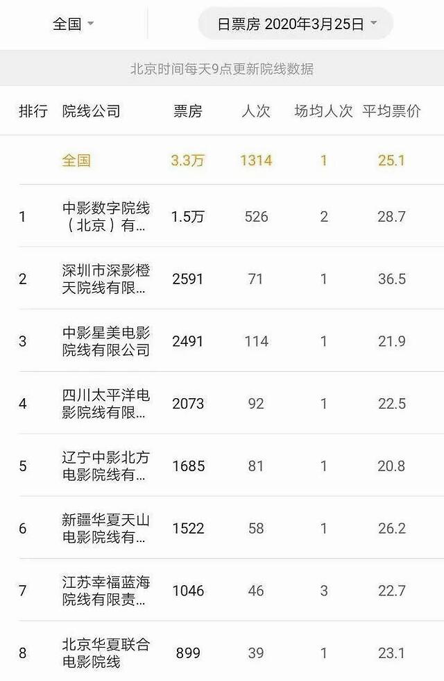 3月25日,全国共复工影院528家,但买票人数只有三千多人,场均人次只有1人,大量的影院甚至一整天一张票都没有卖出去。