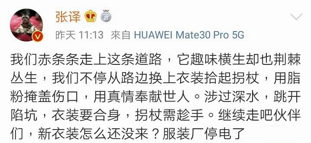 演员张译用“服装厂停电了”来形容这次危机,其中有忧虑,也有对自己和对同行的鼓励。