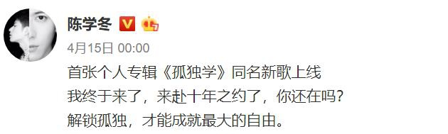 近来,陈学冬开始积极营业。4月15日,他刚刚公布了自己新歌《孤独学》上线的好消息,半个娱乐圈的都来转发。