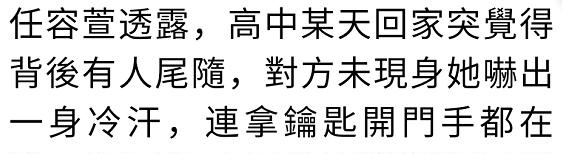 任容萱则透露,高中时期某天放学独自回家觉得背后有人尾随,对方没有现身也把她吓出一身冷汗,当时回到家拿钥匙开门的手都在发抖。