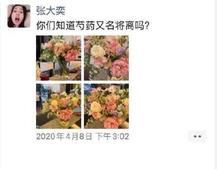 4月8日,也就是一周前,她还发过这样一个意味不明的朋友圈,晒的是芍药花,问“你们知道芍药幽冥将离吗”,这一个“将离”,不免让人多想,是在预告自己的总裁马上就要离婚了?