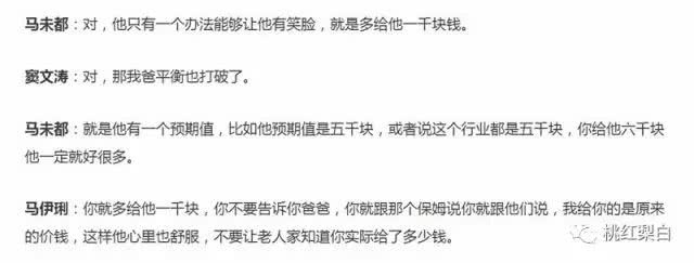 马伊琍特别交代:这种事情,必须自己跟保姆交接好,而且要事先串好话术,口径一致。老人家问起,可以把价钱往少了说,因为不管你怎么跟老一辈儿做工作,他们都会觉得这是浪费钱。