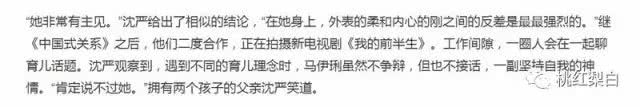 跟马伊琍合作过《中国式关系》、《我的前半生》的沈严也注意到了这种变化:拍戏间隙,大家在一起讨论育儿,观点不同的时候,马伊琍不争辩,但也不接话。守着自己的边界,不试图给别人强加影响。