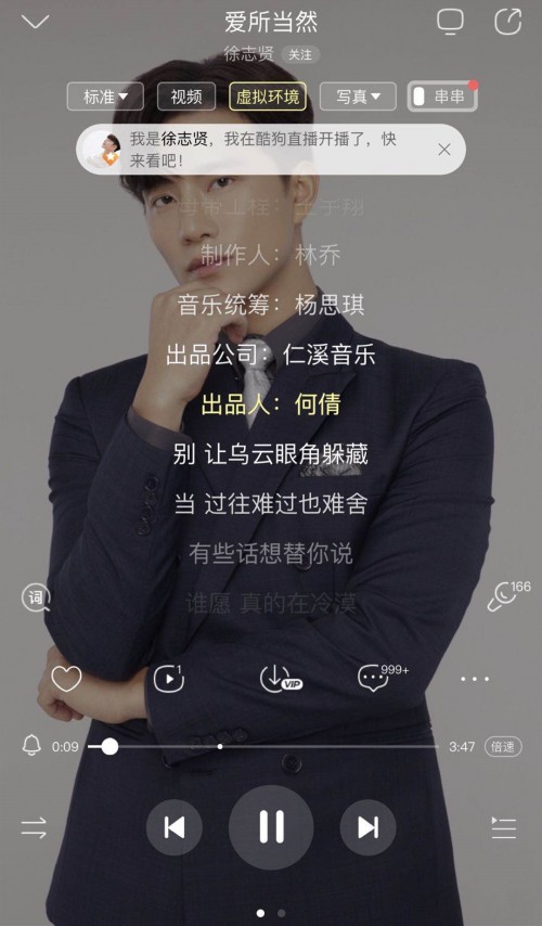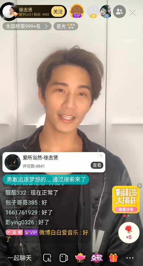 此时直播间源源不断涌入大批来自酷狗音乐的观众,大多人都是在听徐志贤的歌时,收到开播通知,一键跳转直播间。不得不说,酷狗音乐联动酷狗直播的便捷功能,让人有想给酷狗技术小哥加鸡腿的冲动。不仅方便了歌迷为喜爱的歌手打call,歌手更多了一个可以打歌、互动的自我展示平台,实现与歌迷零距离交流!