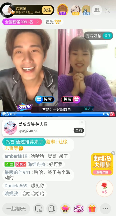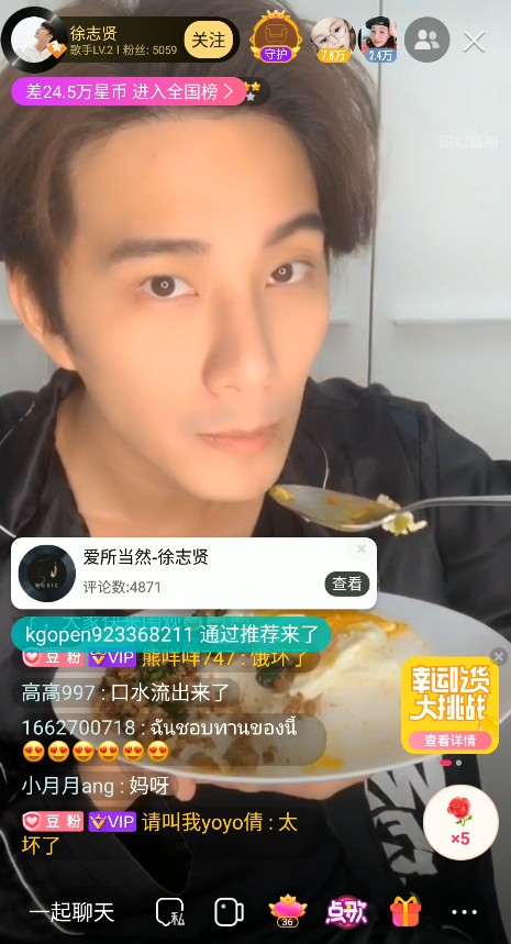 晚上8点半,徐志贤准时在镜头前出现,和大家互动过程中,他发现了酷狗直播“连线PK”的功能,当即兴奋表示“等一下会和大家视频”,大批观众纷纷留言“选我”,公屏几乎被刷爆!预告了连线消息后,徐志贤彻底打开“宠粉模式”,接受观众在公屏上的点歌,一首《告白气球》戳中了无数少女心。