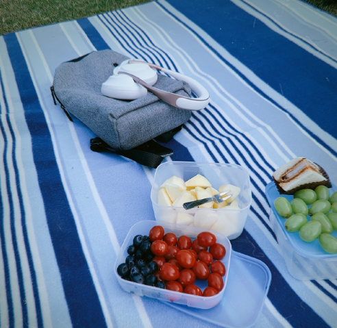 草地的野餐布上,还放着几盒自备的水果,可谓准备充分。