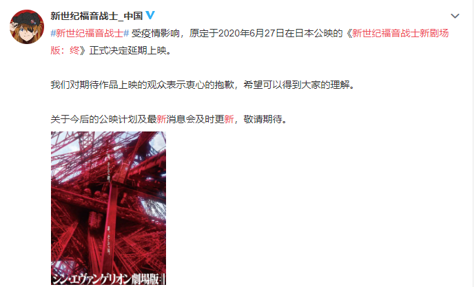 4月17日,受疫情影响,原定于2020年6月27日在日本公映的《新世纪福音战士新剧场版:终》正式决定延期上映。片方表示:“我们对期待作品上映的观众表示衷心的抱歉,希望可以得到大家的理解。关于今后的公映计划及最新消息会及时更新,敬请期待。”