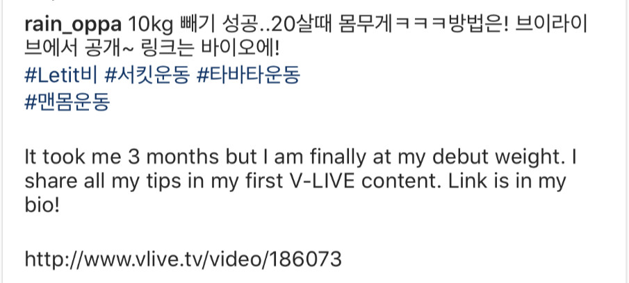4月17日,Rain(郑智薰)通过个人社交平台写道:“成功减掉10公斤,20岁时的体重。”