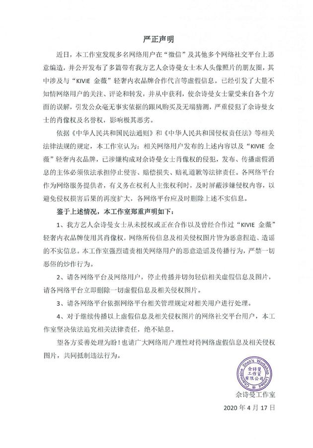 近日,本工作室发现多名网络用户在多个网络社交平台上恶意编造,并公开发布了多篇带有我方艺人佘诗曼本人头像照片的朋友圈,其中涉及与某轻奢内衣品牌合作代言等虚假信息。已经引发了大量不知情网络用户的关注、评论和转发,并从中获利,使佘诗曼女士蒙受来自各个方面的误解,引发公众毫无事实依据的跟风购买及无端猜测,严重侵犯了佘诗曼女士的肖像权及名誉权,影响极其恶劣。