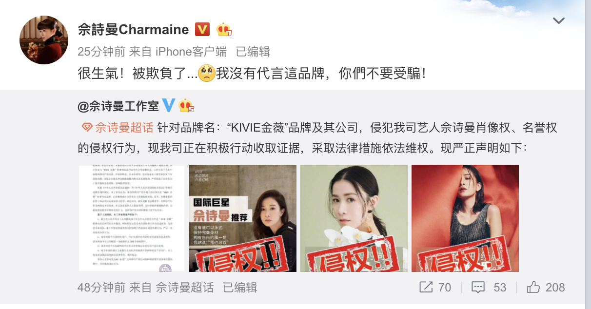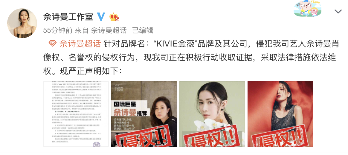 17日,佘诗曼工作室在社交平台就某品牌及其公司侵犯佘诗曼肖像权、名誉权的侵权行为发布严正声明,表示正在积极行动收取证据,将采取法律措施依法维权。随后,随后佘诗曼本人也转发了该声明。