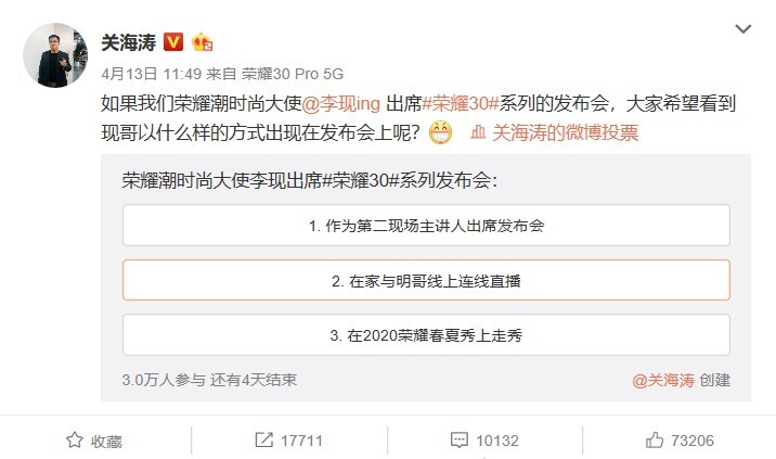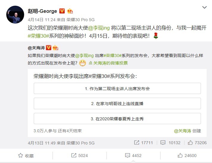 在调动了粉丝热情之后,荣耀进一步挖掘粉丝需求,投粉丝所好,通过权威高层的微博勾起粉丝们的好奇心。并积极与粉丝们讨论李现出席发布会的形式,给予粉丝们无限的想象力。激发粉丝们的热情和好奇心,将品牌、产品、发布会活动等与粉丝、网友建立强关联。
