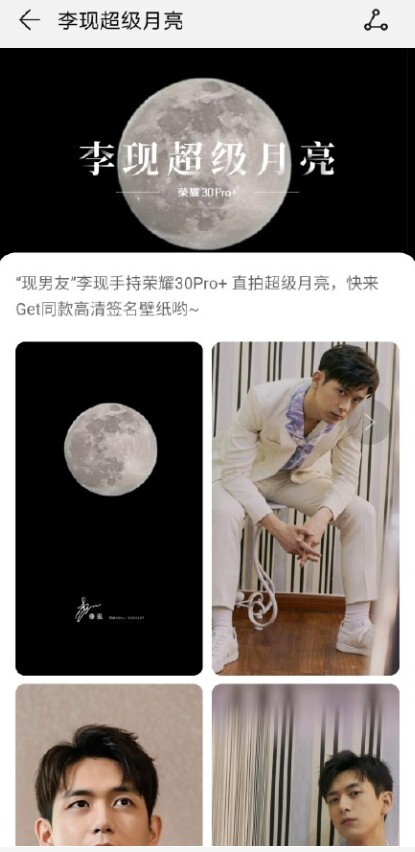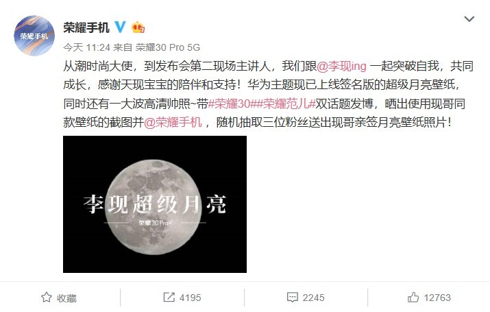 4月16日,华为主题商城正式上线了一组李现签名版超级月亮和李现高清壁纸。在公布上线新壁纸消息的同时,荣耀官微还为天现宝宝们送上福利,将随机抽取粉丝送上李现亲笔签名壁纸。据悉,该高清月亮壁纸是李现用荣耀新机亲手拍摄。消息一经发出,便得到了粉丝们的积极响应。粉丝们自发地在荣耀官微评论区进行评论、展示,并晒出李现和超级月亮高清壁