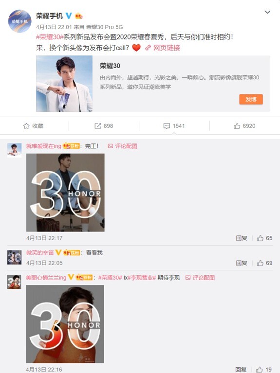 随后,荣耀又通过官博号召粉丝换专属头像,进一步深化与粉丝的互动,为新品牌发布会扩大声量,该活动得到了广大网友的积极参与。通过粉丝、网友的互动参与,实现大众对荣耀新品发布会的持续关注,深化了大众对产品、品牌的认知。