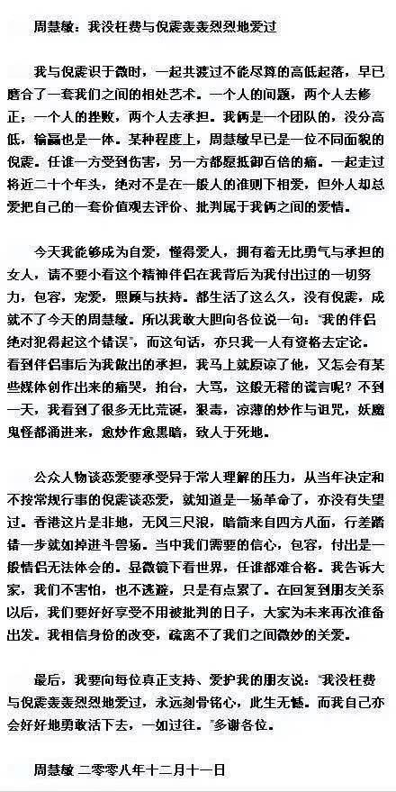就在所有人都等着看笑话,心想外表柔柔弱弱的周慧敏肯定要把倪震狼狈的领回家时,周慧敏却丢了一份让所有人都大赞“有骨气”的分手信,终止了这场闹剧。