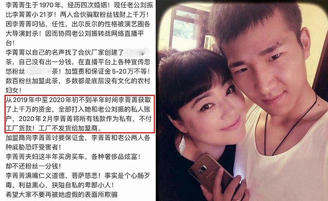 不过正是这样一个生动的形象,却被曝出了诈骗的消息,有消息称,李菁菁和自己的老公刘振一起合伙,以某种商业形式,收取粉丝观众的相关费用和保证金,不过实际上却是一个空壳,并没有实际落地。