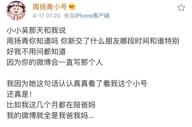 4月17号凌晨,周扬青在小号在发声,曝光了自己近几个月的现状。她称除了日常工作,近期剩下的时间都在陪伴自己的父母,社交平台晒的也都是爸爸妈妈。