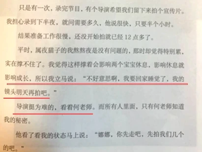 谢娜在书里透露,有一次在录完节目后,导演希望主持人留下来拍个宣传片,谢娜一开始担心要录到下半夜,导演表示说只要半个小时。