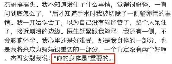 虽然医生指该手术不会影响怀孕,但对她仍是一个打击,幸好还有丈夫张杰的包容和呵护,让她不至于对怀孕失去信心。