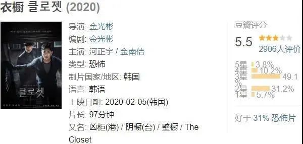 其豆瓣评分,只有区区5.5分,好于31%的恐怖片。创下了河正宇从影以来的豆瓣最低分。