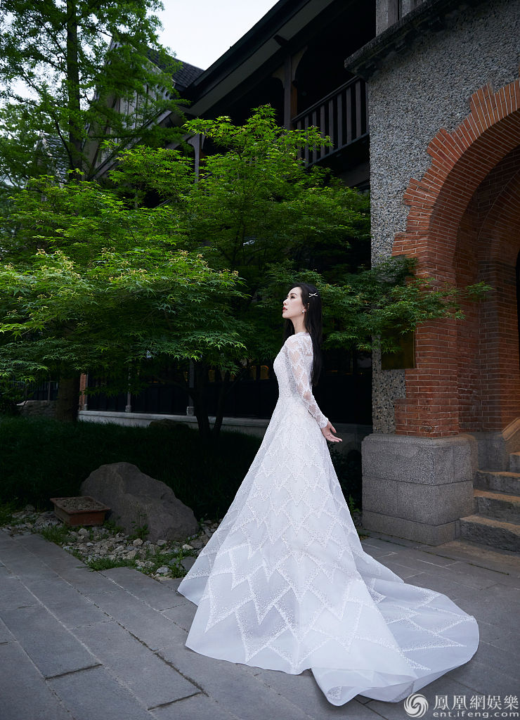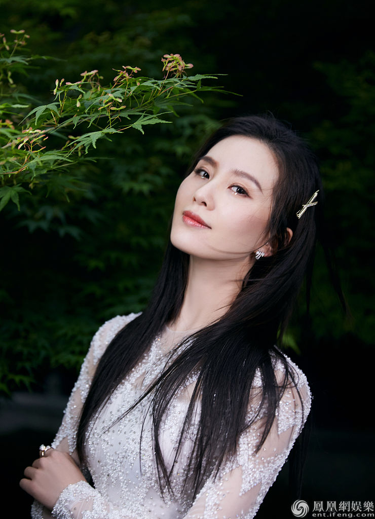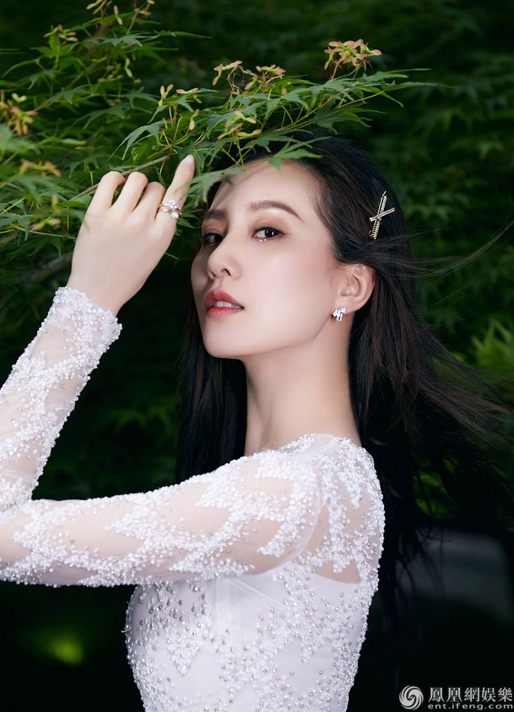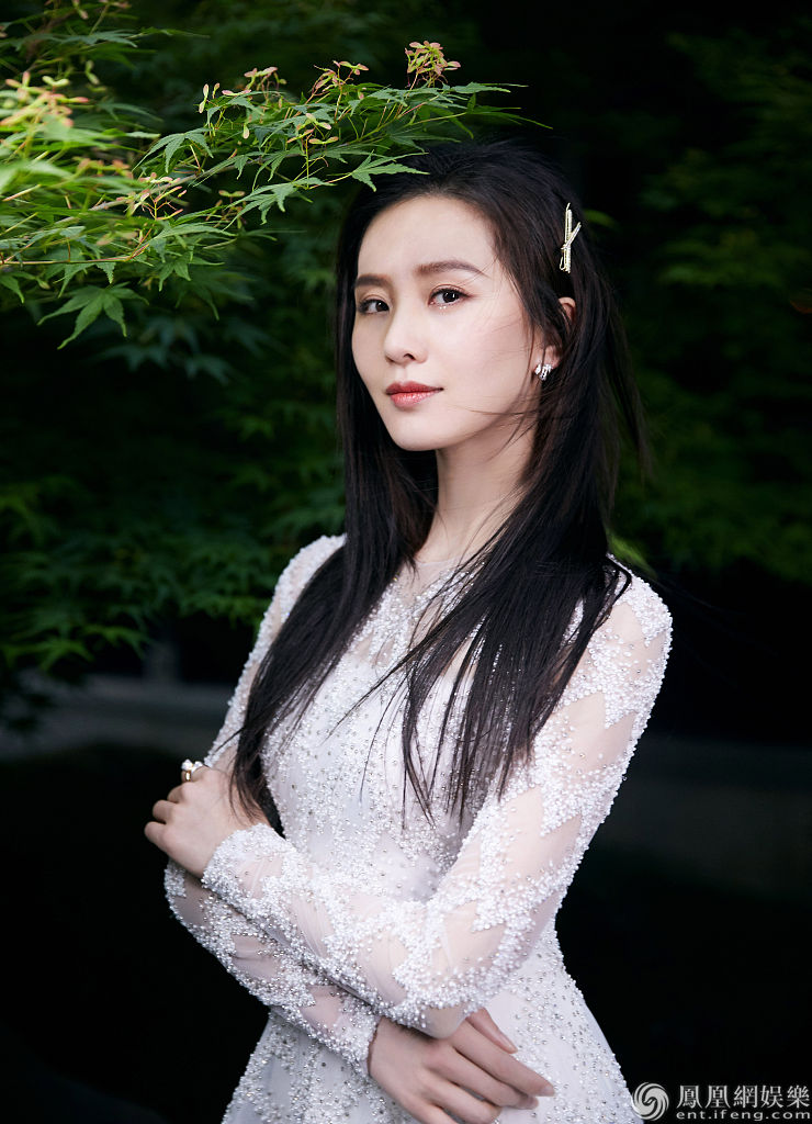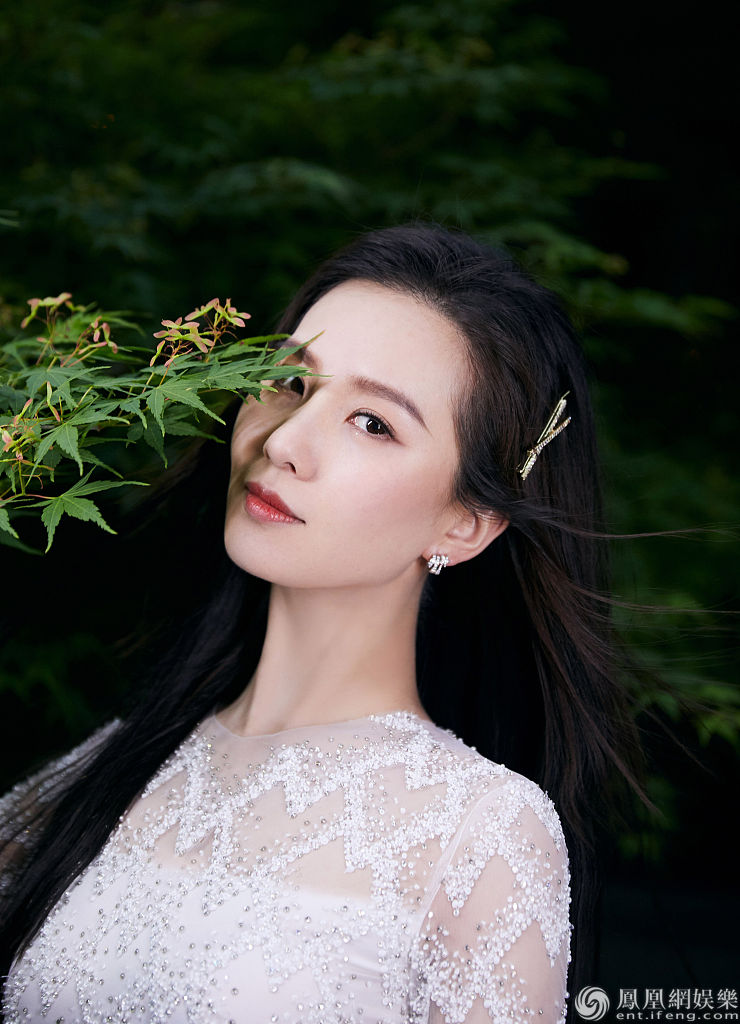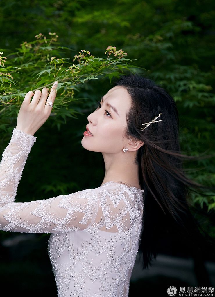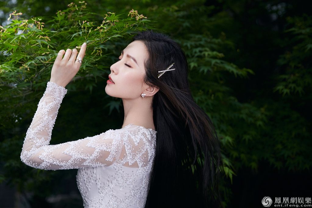 刘诗诗穿着白色蕾丝长裙化身小仙女,黑色长发披肩。