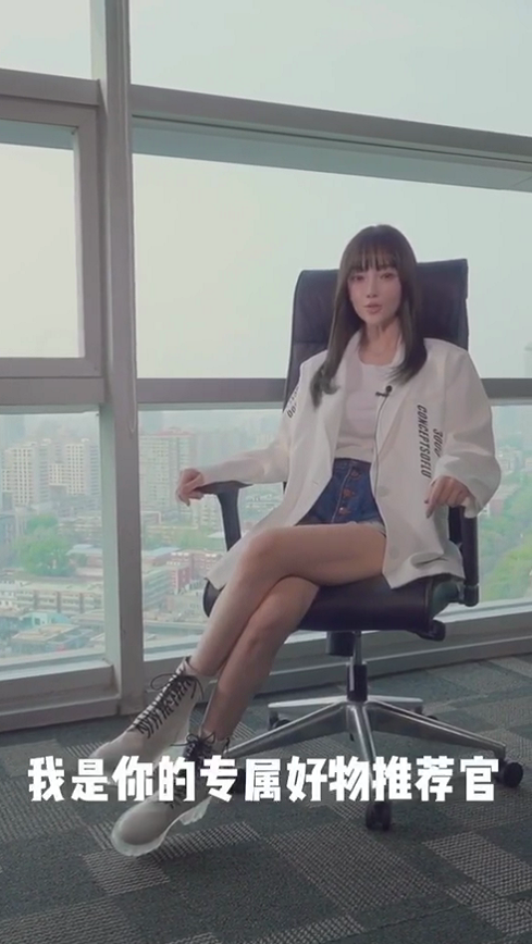 然后,李小璐身穿白色运动上衣,搭配高腰牛仔短裤,坐在办公椅上,一双白皙纤细的大长腿也十分的抢镜,而落地窗外的风景也十分的优美。她转身时也介绍到:“你好,重新认识一下,我是你的专属好物推荐官,李小璐。”