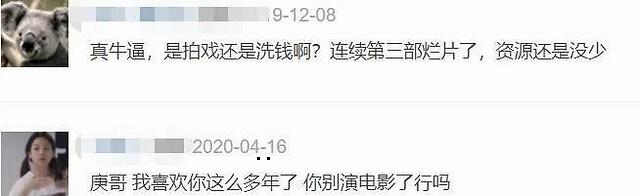 另一位就更直白了,新鲜出炉的评价:庚哥,我喜欢你这么多年了,你别演电影了行吗?