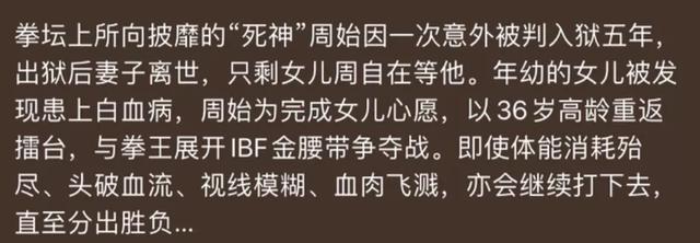 电影剧情并不复杂,韩庚饰演拳击手入狱五年,出狱后发现老婆去世、女儿患上白血病,接着重返擂台,卖点也很明确,父女情和高龄拳手再战赛场的热血。