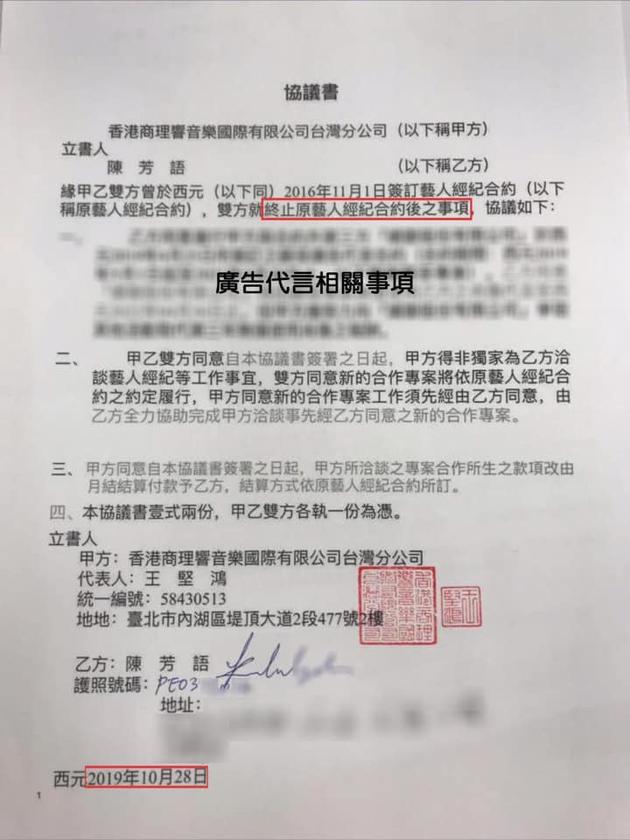 协议书可见时间是2019年10月28日,合约上写着“双方终止原艺人经纪合约后之事项”,也就是以此协议书证明过去“我真的是自由身可以接工作”的言论不假。另外,合约书上第二条也写着:“甲乙(甲:理响音乐,乙:陈芳语)双方同意自本协议书签属之日起,甲方得非独家为乙方洽谈艺人经纪等工作事宜,双方同意新的合作专案将依原艺人经纪合约之约定履行。”