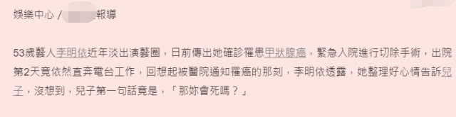 曾经的李明依风光无限,快言快语的主持风格也让她备受争议。不过在转入电台工作后她也收敛了不少,处事更加平和,甚至对待身体上的病痛也能一笑而过。对于自己不幸患上甲状腺癌的事情,李明依也是坦然接受,声称自己什么大风大浪没见过。而回想起自己被医院告知患癌的那刻,李明依也表示“说不心虚是假的,接到医院通知的那一分钟我头皮都有点发麻”。或许自己患病的消息触动太大,李明依在下班回家的路上都处于游离状态,但是想到晚上还要和家人吃饭,李明依也努力平复好心情。
