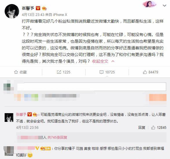 或许是因为张馨予晒居家日常太过频繁,有粉丝就给张馨予发私信称她这样频繁分享自己的私生活,不太好。张馨予则特意发文解释了一番,她称自己这样做是为了和粉丝有更多的沟通,并称商业化的V博并不是她的理想状态。真的是相当真实的爱豆呀。