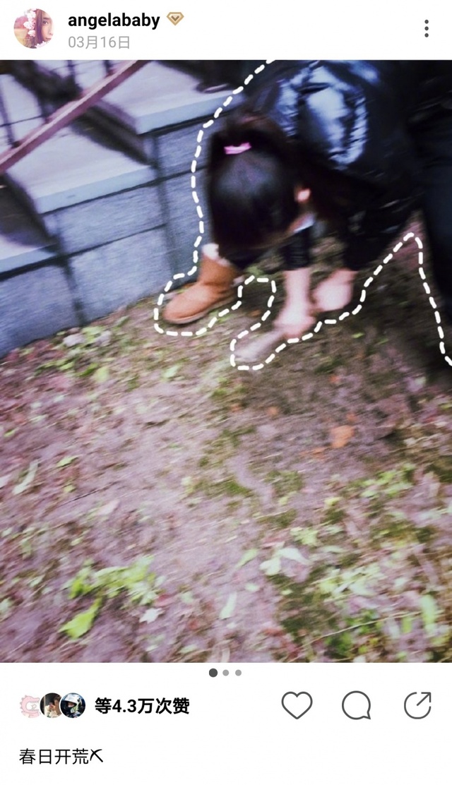 其实在这之前,baby就分享过自己开荒的经历了,当日,baby在自己的个人社交账号上晒出了一组自己干农活的照片,同时配文称:“春日开荒”。照片拍的比较模糊,但也能十分清楚地看到baby扎着马尾低着头,手上拿一个工具,弯着腰正在很卖力地翻地,看起来也是非常专业。