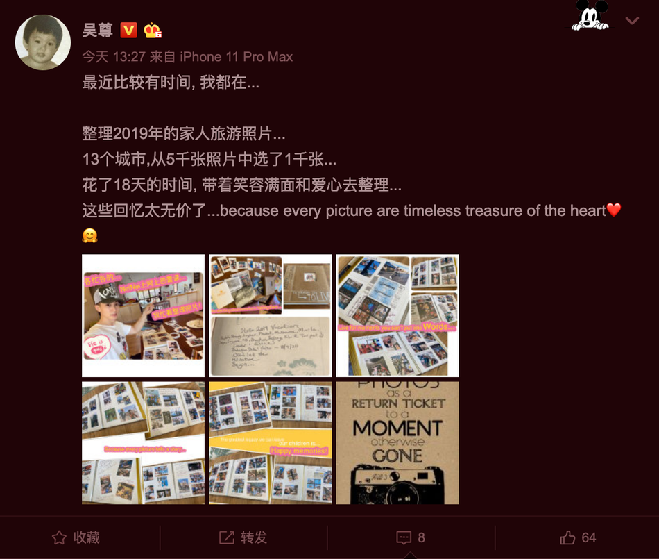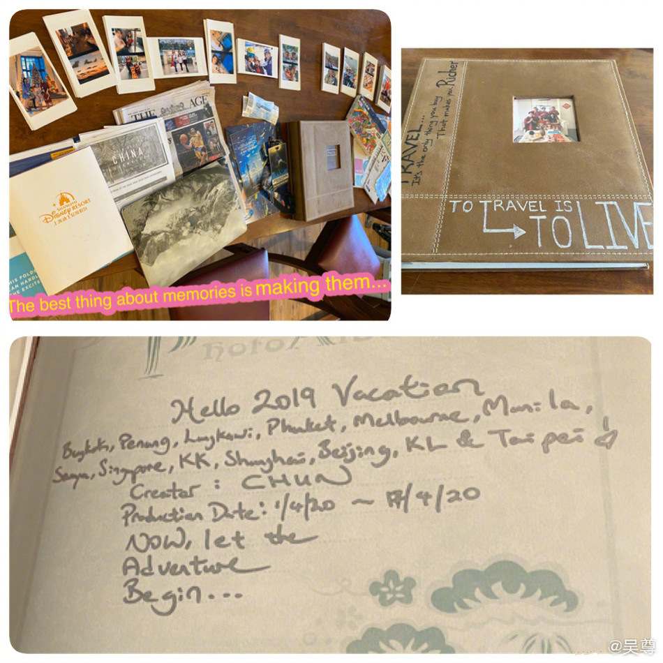 吴尊表示,为了整理2019年的家人旅游照片,他花了18天的时间 从5千张照片中选了1千张。