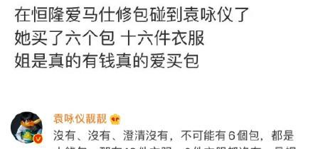 此事被传出来后,大家纷纷羡慕袁咏仪出手阔绰。但是随后这件事情发生了反转,袁咏仪在线辟谣。她表示:没有6个包包,都是小钱包,并且衣服也没有16件,连6件都没有,并且让大家不要夸张,不然进不了家门。可以看出,袁咏仪在私底下是一个非常随性并且爱开玩笑的人吧。